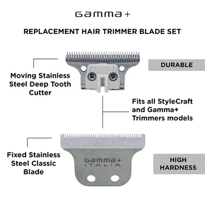 Gamma+ Replacement Stainless Steel Fixed Blade Set with Stainless Steel Deep Tooth Cutter Trimmer Blade is designed for precision trimming and durability. This high-performance blade set ensures smooth, snag-free cuts, making it ideal for professional barbers and stylists.