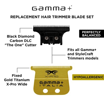 Gamma+ Replacement X-Pro Wide Gold Titanium Blade with Black Diamond "The One" Cutting Trimmer Set delivers precision and durability for professional grooming. The gold titanium wide blade ensures smooth, snag-free cutting, while the Black Diamond coating provides long-lasting sharpness and rust resistance.